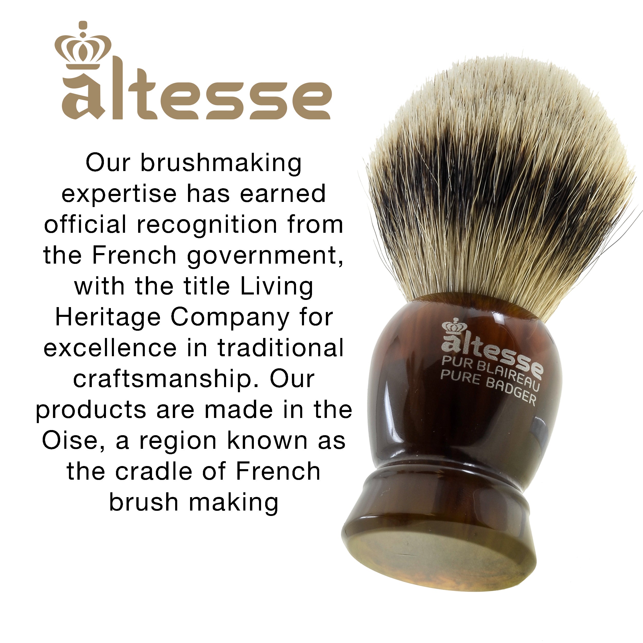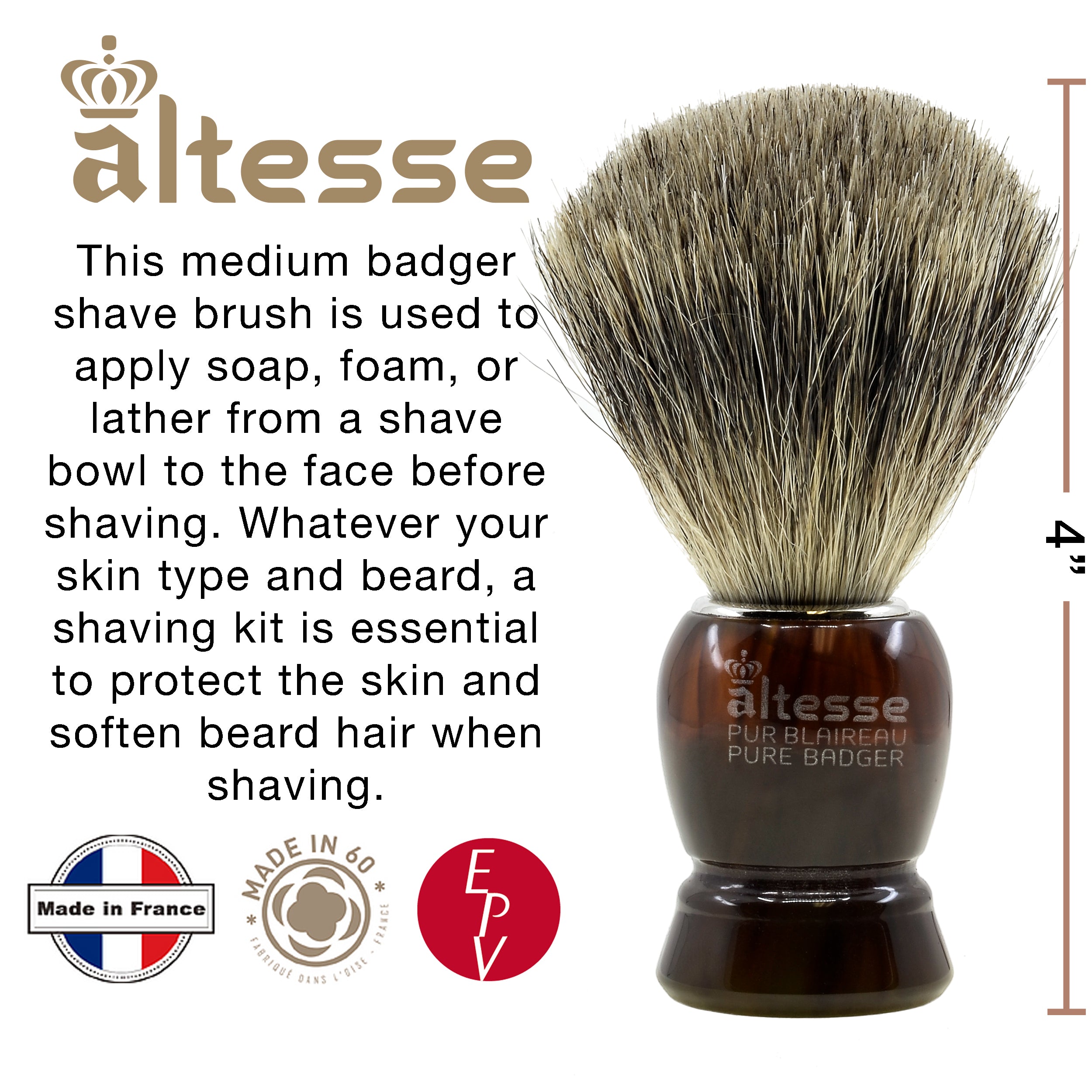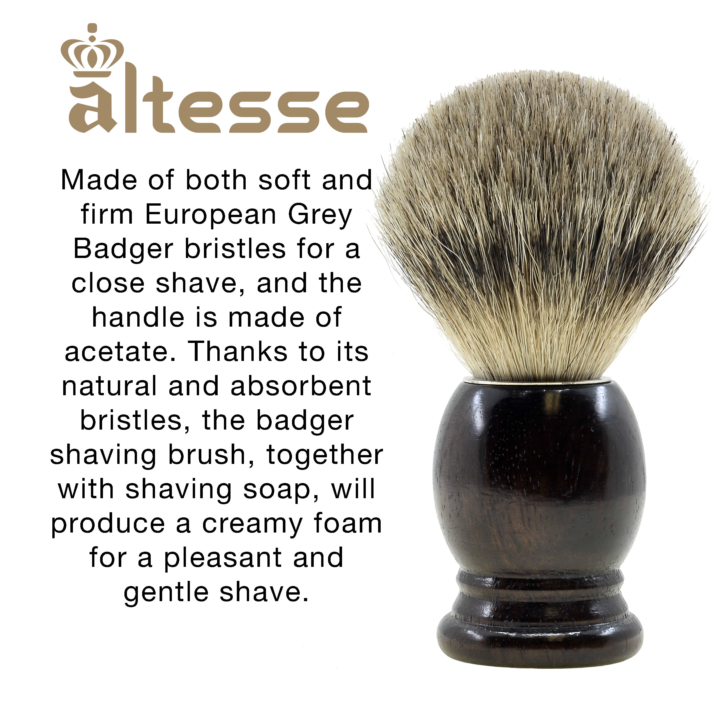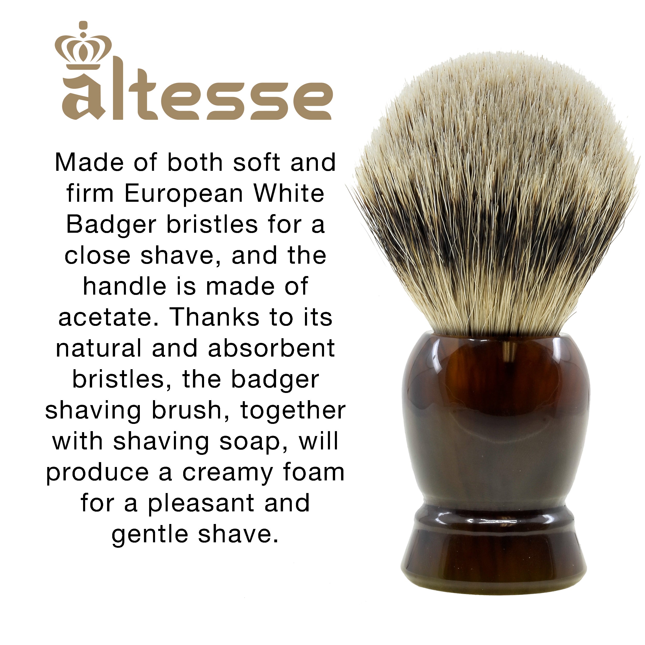 - Made of both soft and firm badger bristles for a close shave, and the handle is made of acetate. Thanks to its natural and absorbent bristles, the badger shaving brush, together with shaving soap, will produce a creamy foam for a pleasant and gentle shave