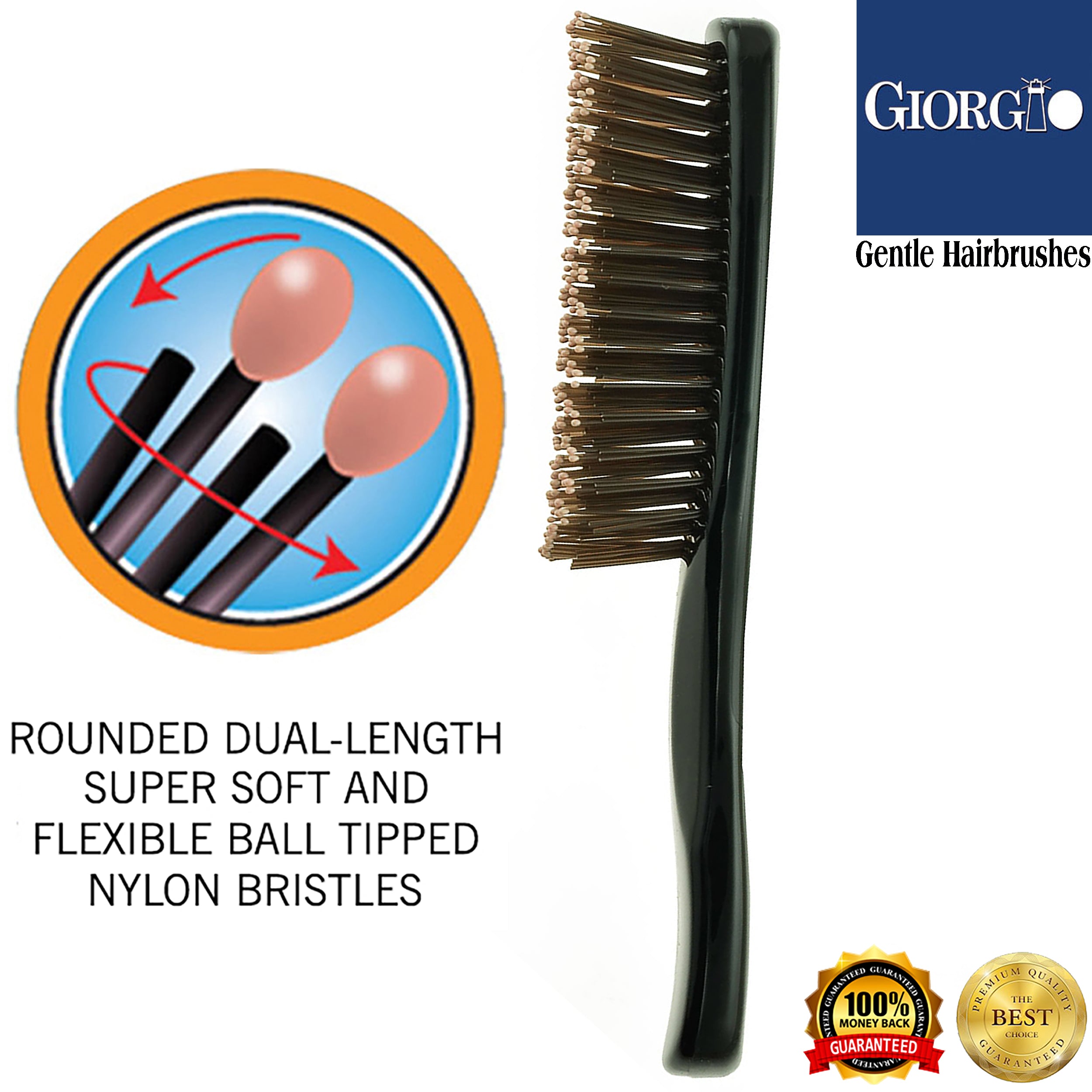 - Super soft and flexible ball-tipped nylon bristle hair brushes for women and hair brush for men. Dimensional design dual-length rounded tip bristles for a gentle touch scalp brush and massager that detangles while stimulating promoting shiny, healthy hair.