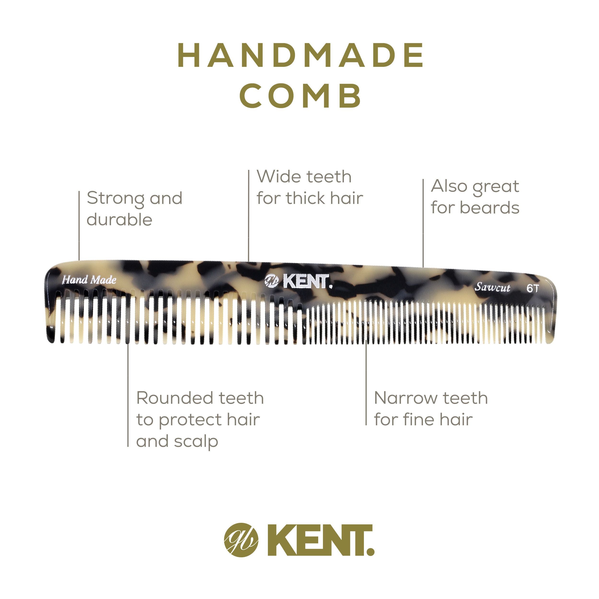 • Handmade Kent comb: Handmade from a large sheets of cellulose acetate rather than being molded. This material is tactile, flexible and strong, a non-petroleum based derived from plants that has been found to create less static in hair, and is saw-cut to ensure a smooth surface that will not pull or snag hair follicles